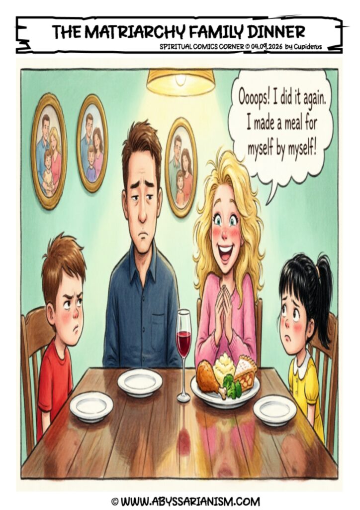 But try to tell the FEMINIST MATRIARCHY this fact. They refuse to accept their fault in breaking the natural pattern of family behavior. The outer shell of life is there home, family dinner table, family portraits on the walls, but no substantive action of the 4th Government exist in reality. That makes this picture: “FAMILY MATRIARCHY DINNER DRAMA” funny. We all know this is not the pattern that’s supposed to be operating; the pattern were supposed to be obeying.